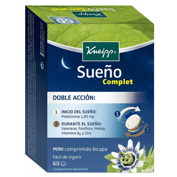 https://www.mifarma.fr/kneipp-sommeil-complet-60-comprimes154708392196Kneipp Sommeil Complet 60 comprimés<p><b>Complément alimentaire</b> à base de valériane, passiflore, mélisse, vitamine B6 et zinc.</p><p> Vous aidez à vous endormir plus rapidement et à passer une bonne nuit de sommeil.</p><p> Mini bicouche compressé facile à digérer.</p><p> Grâce à sa première couche de libération immédiate, il aide à réduire le temps d endormissement.</p><p> La deuxième couche à libération prolongée des extraits de valériane et de passiflore, qui aide à maintenir un sommeil naturel, de la mélisse qui contribue à une relaxation optimale, de la vitamine B6 qui aide au fonctionnement normal contient du système nerveux et du zinc.</p>https://assets.atida.com/transform/1b8123ec-dbfe-4a38-ab26-ee35b8f5378b/Kneipp-Sueno-Complet-60-Comprimidos?io=transform:extend,width:250,height:25014.99instock15.9913.26548572566461Kneipphttps://www.mifarma.fr/media/catalog/product/1/d/6/e/1d6ea2a24aa239c8c3d91b241016140fec82f1d5_Product_Tile_Thumbnail_Kneipp_Sueno_Complet_60_Comprimidos.png/Vitamines et Compléments/Compléments/Sommeil/Vitamines et Compléments/Vitamines et Compléments/Compléments/Black Friday/cyber_monday_pt_int/Atida Cash 5%/Jusqu’à 70 % de réduction/NO MIFARMA DAYS/Singles' Day: -70 %!/–15 % sur tous les produits Kneipp2024-09-16T05:43:34+0000